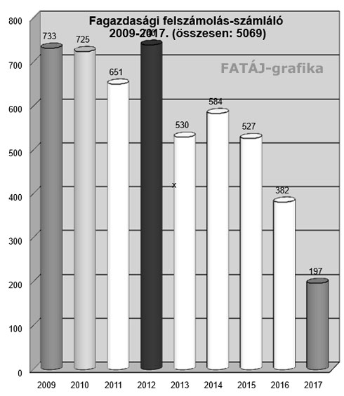 09.30 A hivatalos adatbázisok alapján 256 vállalkozás került fel listánkra, amelyből 203 esetben felszámolási vagy kényszertörlési eljárás (a továbbiakban f.a.) és 53 esetben végelszámolási eljárás (továbbiakban: v.a.) indult. Az elérhető információk szerint ez legalább 412 munkavállaló számára jelent munkahely-változtatási kényszert. Ezen cégek összesített éves forgalma 6 532 millió forint nagyságrendet képviselt. Ennek megfelelően a 2017-ben megszűnő cégek átlagos mérete: 1,61 fő alkalmazott, 25,52 millió Ft-nyi éves árbevétel. Az előző év hasonló időszakában 293 (ugyanez: 2015-ben: 397: 2014-ben: 458: 2013-ban: 288; 2012-ben: 580; 2011-ben: 510; 2010-ben: 519; 2009-ben: 571) fagazdasági vállalkozás volt ilyen helyzetben. Összehasonlításul az országos mindösszesen cégadat: 26303 vállalkozás ellen indult eljárás, 18314 cégnél felszámolás vagy kényszertörlés, 7989 cégnél végelszámolás. 2017-ben, szeptember végéig Magyarországon 19860 új vállalkozás indult, ebből a fagazdasághoz kapcsolódó tevékenységet tervez (legalább) 304 cég (ami az összes alakuló társaság 1,53%-a).