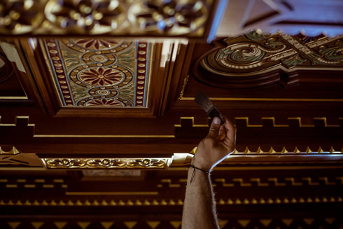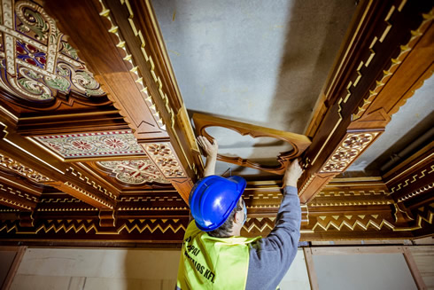 A mennyezet és a díszek bejárati ajtók kivitelezését végző Pápai Asztalos Kft kollégája beilleszt egy panelt