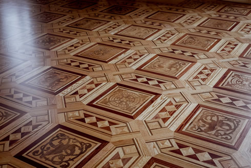 A rendkívül összetett intarziás padló fő motívuma a sárkányforma, az elemek minden anyaga hármas: vörös tölgy, fekete dió és dél-amerikai mahagóni. A parkettát a terem széleinél a falburkolat alá befutó, geometrikus mintájú díszcsík kíséri.