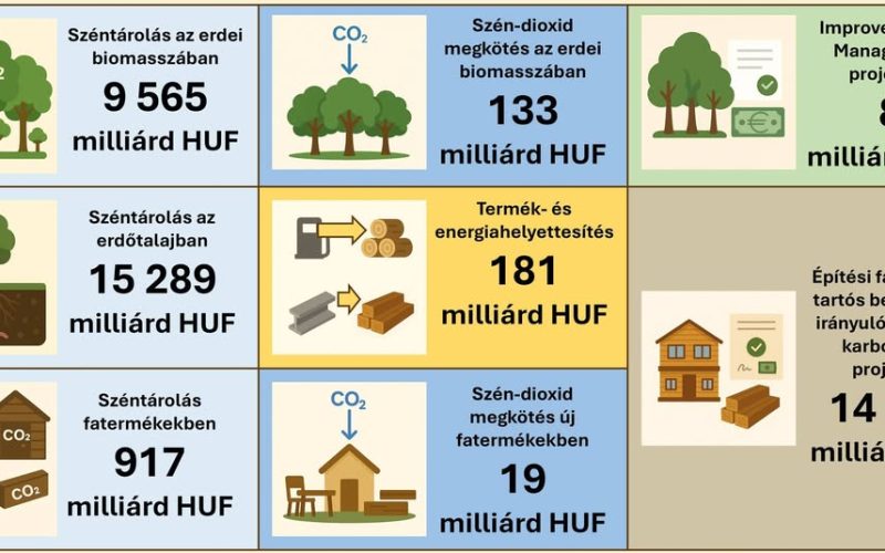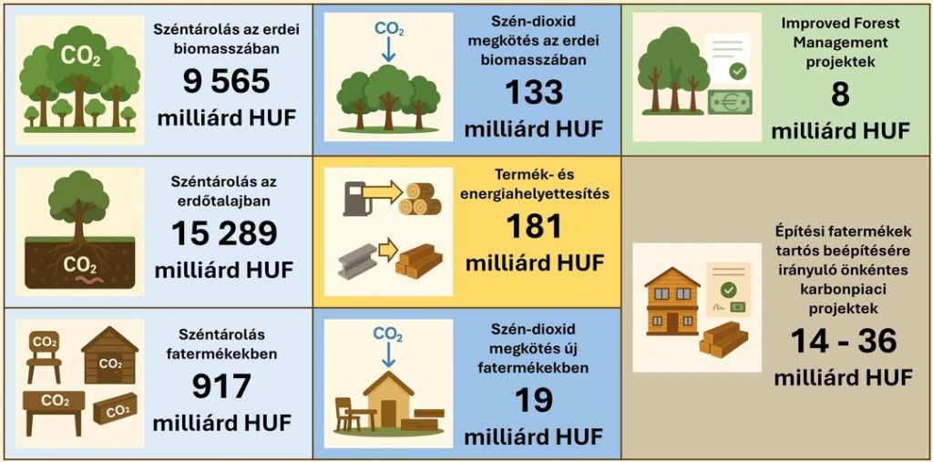 A hazai erdők és fatermékek teljes széntároló képessége 1 289 millió tonna CO₂, aminek az elméleti értéke több mint 25 772 milliárd forint.