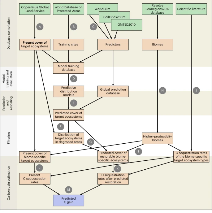 A Nature Geoscience folyóiratban megjelent nemzetközi kutatás eredményei meglepően nagy eltérést mutattak. A tanulmányból kiderült, a legtöbb forgatókönyv alapján az ökoszisztémák helyreállítása csak kis mértékben csökkenti a légkör szén-dioxid-szintjét. Még a legoptimistább – „legzöldebb” – jövőkép esetén is legfeljebb az emberi kibocsátások 17%-a köthető meg 2100-ig, míg ha minden marad a jelenlegi mederben, ez az arány 4% alá esik.