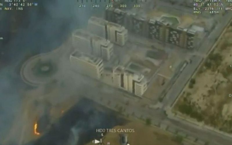 A 112-es segélyhívó központ közzétett egy videót arról, hogy a tűz hogyan közelíti meg a lakóházakat a spanyol fővárostól északra fekvő Tres Cantos településen.