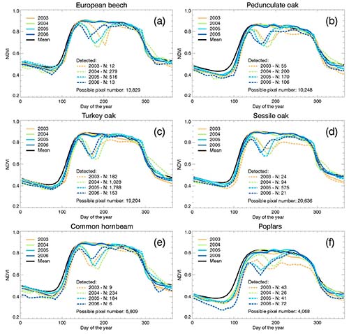 A fénycsapdás megfigyelések 2004-ben mutatták a lepke-populáció tetőzését (21 415 egyed), de a legsúlyosabb lombvesztést a műholdas NDVI és LAI indexek alapján 2005–2006-ban szenvedték el az erdők.