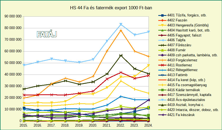 A halmozatlan ábrán még feltűnőbb a fűrészáru nagy behozatali értéke a többihez képest, illetve így jól látható, hogy a 2023. évi zuhanást enyhébb további csökkenés követte.