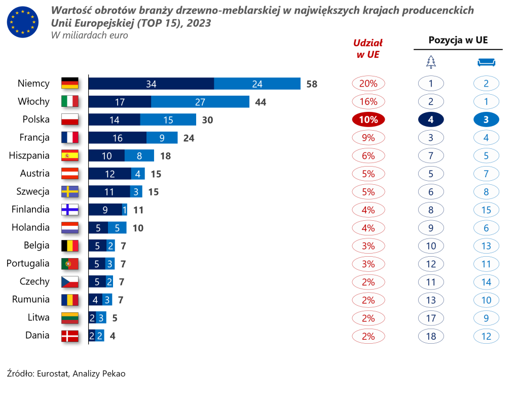 Lengyelország megszilárdította pozícióját az EU egyik legfontosabb szereplőjeként, vitathatatlanul a harmadik helyet foglalja el az Unió teljes fa- és bútorforgalmában, ami az EU összesített piaci értékének körülbelül 10%-át teszi ki.