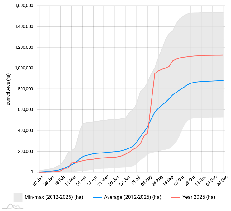 A térkép az EFFIS által 2025-ben megfigyelt tűzvészek mértékét és földrajzi elterjedését mutatja. Minden színes kör egy korábban aktív tűzvész által elpusztított területet jelöl, mérete és színe arányos a hektárban kifejezett érintett terület nagyságával.