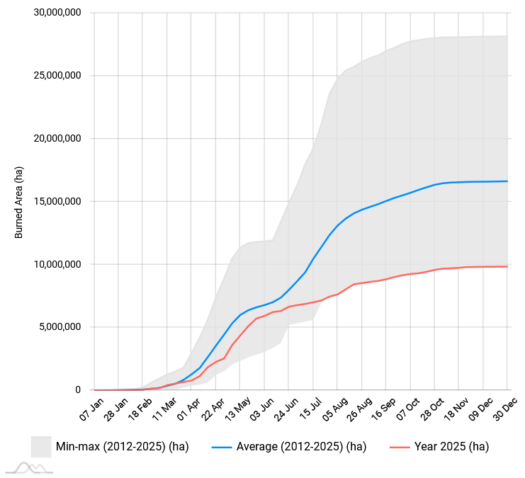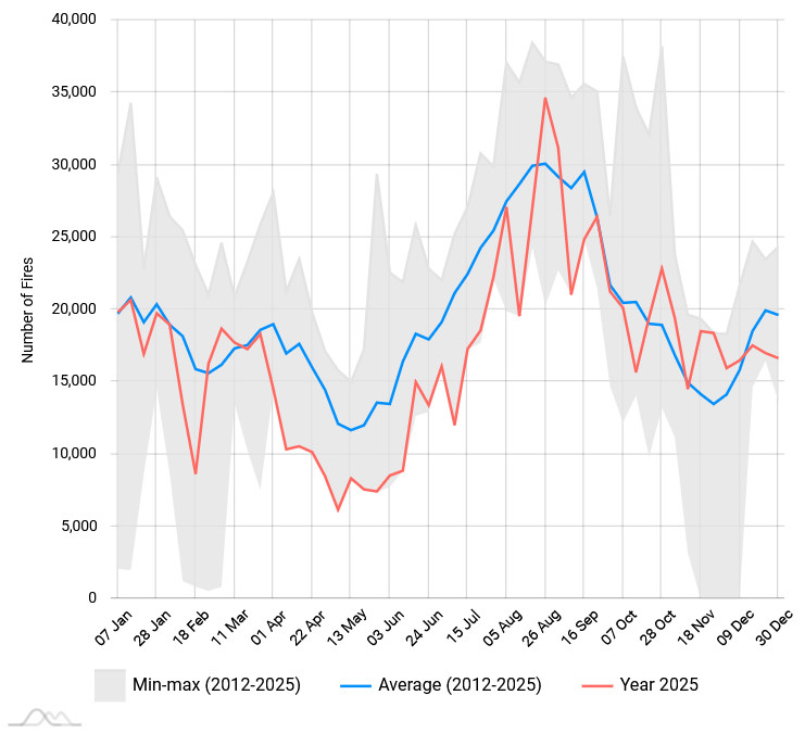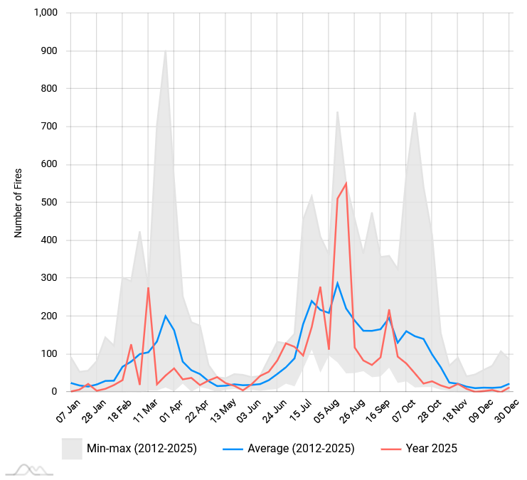 Néhány grafikonnal igyekszünk szemléltetni az Európai Uniós országokban, Európában, illetve a Föld egészén 2025-ben pusztított erdőtüzek, vegetációtüzek számát, az érintett területeket! Az adatok forrása az európai erdőtűz-információs rendszer a Kopernikusz veszélyhelyzet-kezelési szolgáltatása (EFFIS), amelyet a JRC (Közös Kutató Központ) hajt végre.