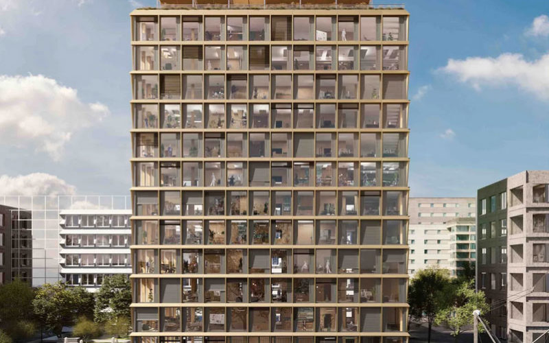 A Mainzer Zollhafenben található Timber Peak faanyagot és modern építőanyagokat kombinál erőforrás-kímélő és körforgásos fa-hibrid felhőkarcolóban © UBM Development Deutschland GmbH