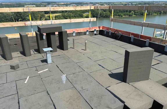 A Foamglas T3+ magas nyomószilárdságával, égésállóságával (A1) és teljes víz- és párazáró képességével védi a Timber Peak fa-hibrid szerkezetét © KOCH Bedachungen GmbH