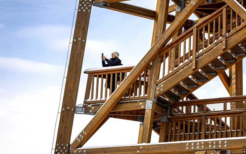 A fenyőből és tölgyből épült kilátó első két szintjén pihenőpadokon fújhatjuk ki magunkat, amíg felérünk a lépcsőfokokon.