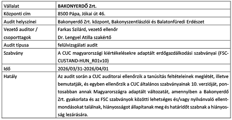 A Bakonyerdő Zrt. erdőgazdálkodásának (Bakonyerdő Zrt. Központ, Bakonyszentlászlói Erdészet, Balatonfüredi Erdészet) felülvizsgálati auditja 2026. március 31. – április 1. között zajlik, a Control Union auditora várja az érintettek észrevételeit.