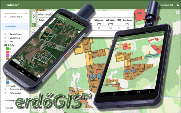 Az erdőGIS™ pontos térképi megjelenítést nyújt a hivatalos digitális erdészeti térképi adatbázis használatával, számos tematikus térkép közül választhatunk, a térképen a GNSS pozíciónk is megjelenik.