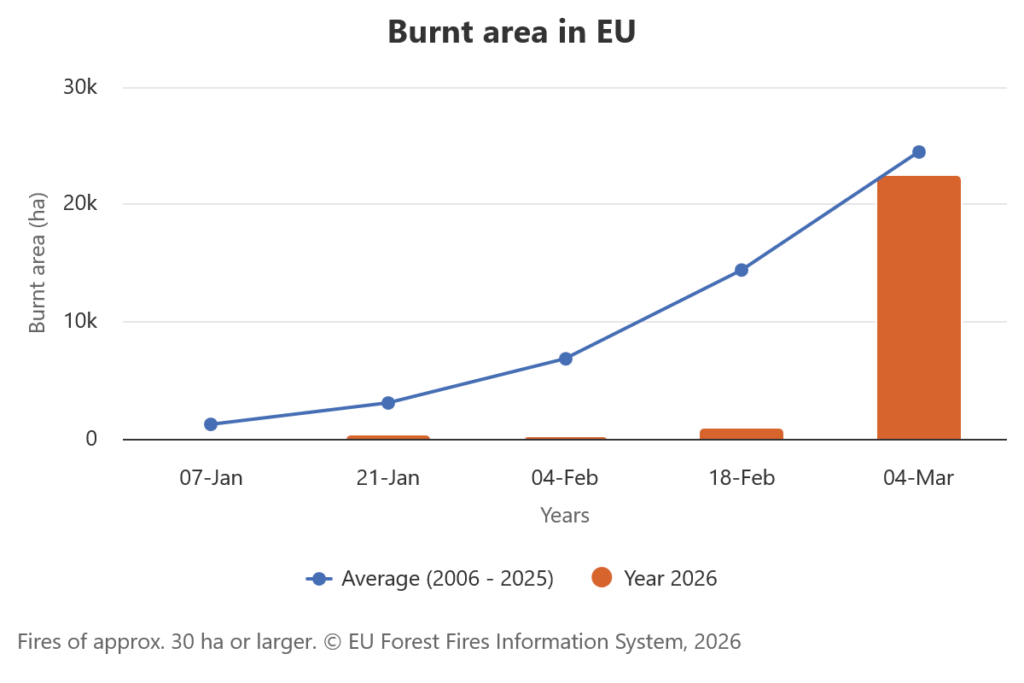 Az erdőtüzek helyzete az EU-ban – aktualizált változat: 2026. március 9.