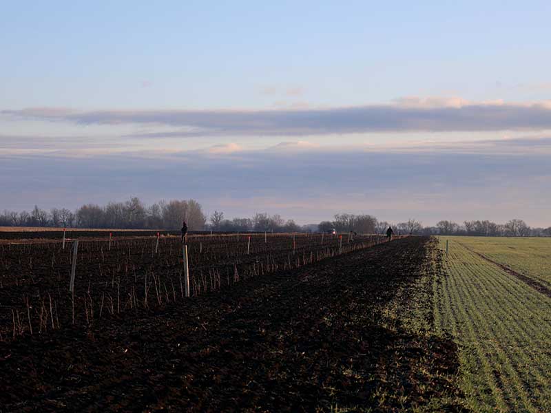 Jelenleg befejeztük a telepítést, többéves, iskolázott csemetékkel, amelyeket őszi talajelőkészítést követően gödörfúróval ültettek el, és most a gyökérzet megerősítése érdekében tőre vágnak.