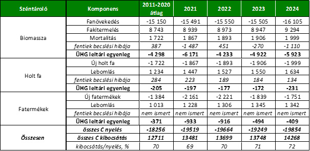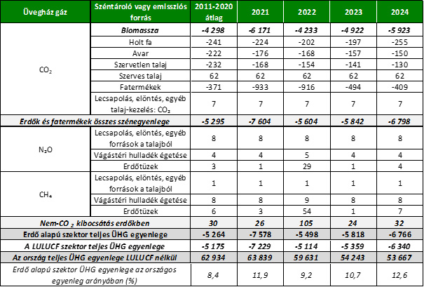 Tekintettel arra, hogy a széndioxid csak egyike a sok üvegház gáznak, érdemes először áttekinteni a szektor teljes ÜHG forgalmát. A főbb számokat az 1. táblázat foglalja össze. Ez alapján megállapítható, hogy az erdő alapú szektor összességében az utóbbi években (de már évtizedek óta) nettó nyelőként működő rendszer volt, vagyis a klímaváltozást lassítja; ugyanakkor a becsült nettó egyenleg (részben természetes, részben módszertani okok miatt) ingadozó.
