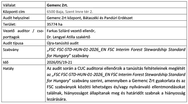 A Gemenc Zrt. erdőgazdálkodásának (Gemenc Zrt Központ, Bátaszéki Erdészet, Pandúri Erdészet) újra-tanúsító auditja 2026. május 19-21. között zajlik, a Control Union auditora várja az érintettek észrevételeit.