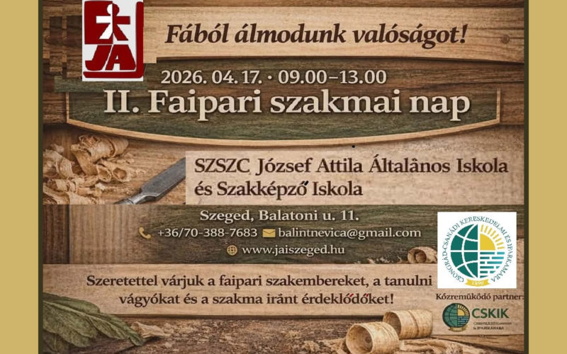 2026. április 17-ére szervezte meg az SzSzC József Attila Általános Iskola és Szakképző Iskola a II. Faipari Szakmai Napot, mely aznap reggel 9-től délután 1-ig tart.
