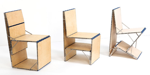 Hurok szék - Loop chair - multifunkciós bútor 7 db eltérő hosszúságú rétegelt lemez táblát kapcsolt speciális zsanérokkal hurokba Boaz Mendel. Az így kialakított szerkezet, a szintén speciális oldal-rögzítő elemekkel, 12 különböző alakú és funkciójú bútordarab megformálását teszi lehetővé.