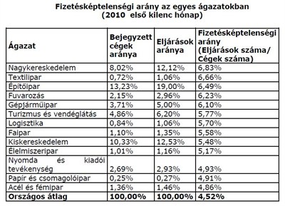 A kockázatosságot reálisan tükröző fizetésképtelenségi hányadot (az egyes iparágakban tevékenykedő cégek számát összehasonlítva az eljárások számával) vizsgálva látszik, hogy évek óta nem történik érdemi változás a kockázati rangsorban. Élen a nagykereskedelem, amelyet a textilipari, valamint építőipari tevékenységet folytató vállalatok követnek de az országos átlag felett található számos más ágazat is, mint például a fuvarozás, a gépjárműipar, a turizmus és vendéglátás, vagy a faipar.