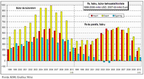 2010 I. félévében a külkereskedelmi forgalom export volumene 18%-kal, az importé 15%-kal b ővült az egy évvel korábbihoz képest. Az euróban számított kivitel volumene 21%-kal, a behozatalé 17,4%-kal bővült. A külkereskedelmi mérleg 2.860 millió euró többletet mutatott, az el őző évi 1.590,5 millió euróval szemben. Ez 1.269,5 millió euró javulást jelent. A külkereskedelmi forgalom forintárszintje exportban és importban 4,5%-kal csökkent az el őző év azonos időszakához képest, így a cserearány lényegében nem változott. A forint az euróhoz viszonyítva mintegy 6,4, a dollárhoz képest pedig 6%-kal értékelődött fel. A 2010 I. félévében a kivitel összessége 78-22 arányban, a behozatalé 69-31 arányban oszlott meg az EU tagállamai, illetve az unión kívüli országok között. Az új tagállamokkal (12 újonnan csatlakozott) folytatott külkereskedelemben az import 15,1%-os, az export 19,4%-os részt képvisel. Az ezen országokba irányuló forgalom dinamikája az átlag körüli ütemben emelkedett, az export euróban 21,1%-kal, az import 17,5%-kal emelkedett. A régi tagállamokba irányuló export 18,5%-kal, az import 16%-kal emelkedett. Az Unió egészét tekintve a kivitel 19,1%-kal a behozatal 16,3%-kal volt magasabb, mint egy évvel korábban. Az unión kívüli országokkal folytatott kereskedelemben a kivitel 28,1%-kal, a behozatal 20%-kal haladta meg az egy évvel korábbit. 2010 júniusában a külkereskedelmi forgalom volumene mind exportban, mind importban jelentős mértékben emelkedett, a kivitel 19,8%-kal, a behozatal 14,5%-kal volt magasabb mint egy évvel korábban. Az euróban számított kivitel 24,5%-kal, a behozatal 20,9%-kal nőtt a 2009 júniusi szinthez képest. A fa alapanyagok 2010. I. félévi forgalma pozitív egyenleggel zárt, mértéke meghaladja a 3,8 milliárd forintot. A behozatal forintban 8,1%-kal, kivitelünk pedig 7,7%-kal nőtt. A fatermékek kivitele ez év első félévében 6,1%-kal emelkedett, míg behozatalunk 10%-kal mérsékl ődött. Az egyenleg jelentős mértékben növekedett az export és import ütemnövekedésének jelent ős különbsége miatt, így az 65%-kal meghaladja az egy évvel korábbit.