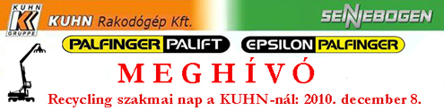 Szakmai nap a Kuhn Rakodógép Kft-nél A KUHN Rakodógép Kft. ezúton hívja meg az érdeklődőket a hulladékrakodás és hulladékfeldolgozás aktuális kérdéseiről szóló, gépbemutatókkal egybekötött SZAKMAI NAPRA, 2010. DECEMBER 8.