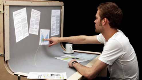 BendDesk - a nagybetűs Munkaasztal Érdekes új variációt alkottak az Aacheni Egyetem média-számtechesei a munkaasztal témájára: vetítőkkel és érzékelőkkel egyetlen hatalmas, többérintéses munkafelületet alakítottak ki egy klasszikus munkaasztalra emlékeztető bútordarab, a BendDesk formájában.
