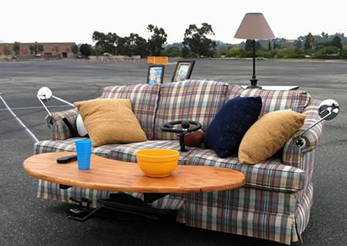 A kanapékocsi nagyon kabriójellegű, teteje egyáltalán nincs, karosszériája pedig eléggé viseltes, mivel - sokat - használt kanapé. A háromszemélyes bútor kormánya középen van, az ülőpárna elejéből áll ki, a bal karfát visszapillantó tükörrel látták el - krómozottal. A kanapéautó eleje dohányzóasztal, amelyet az ülőbútorhoz rögzítettek. Sebességváltója nincs, viszont a négykerekű kanapénak gáz- és fékpedál emberi lábfej-alakú.