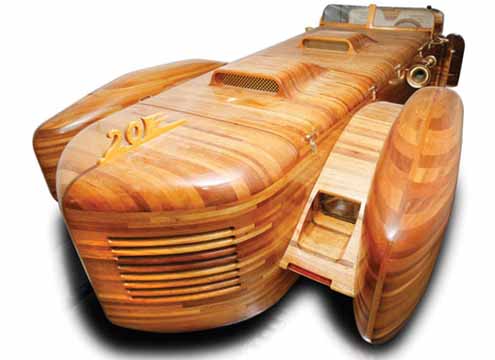 A gyors: Lambo verő, Porsche üldöző, fatelep szökevény. Itt nem a poén volt a lényeg, Joe Harmon és csapata úgy gondolta használható autót épít, fából. Klasszikus szupersport, középmotoros, alacsony kétüléses, 700 lóval a vezető mögött. Az alapanyagban a minimális súlya legjobb, a gép alig lesz több mint egy tonna, így a végsebességet 240 mérföld körülre ígérik. Még nincs kész, de a látványtervek alapján még fémből is a legtetszetősebbek közzé tartozna. Érdekes kérdés a stabilitás, biztonság megvalósítása. Laminált elemekből, faiparban használt bútorlapokból, narancsfából el lehet érni azt a szilárdságot, amit egy szupersport gép megkövetel? Mélyebben a témáról az igényes saját honlapjukon, blogjukon.