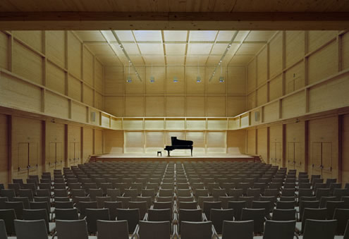 Az épület tiszta, szimmetrikus, visszafogott szerkezettel rendeklezik. A nyugalmat árasztó fehér falak nagy felületű üvegpadlókkal kapcsolják össze a külső és belső tereket. A közel 600 férőhelyes koncertterem belseje fával burkolt, a gondosan tervezett ívezéssel együtt a kamarazenének megfelelő akusztikát biztosítva.