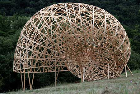 1.1. Csiga Csoportvezetők: Huszár András - építész, HA Építész Iroda és Nagy Nándor - építész, BLOKK Építész Műhely Csapattagok: Antal Ágota, Hertel Anna, Lázár Csaba, Müller Vilmos, Perge Diána A Csiga a Művészetek Völgye programsorozat hivatalos nyitó eseményéhez készült. A terv véglegesítését sok kísérletezés előzte meg. Kezdetnek a 4x4 cm-es léceket felszeletelték és a 3-6 mm-es darabok hajlíthatóságát vizsgálták meg, majd az építmény héját úgy alakították ki, hogy az hálós, merev rendszert alkosson. A projekt megvalósulásáért a csapat folyamatosan, feszített tempóban dolgozott, az alkotóhét ideje alatt pedig több látogató is csatlakozott hozzájuk hosszabb-rövidebb időre. Igyekeztek a szerkezetet minél könnyebbre készíteni, végleges súlya 300 kg alatt van, így 8-10 ember már meg tudja emelni azt.