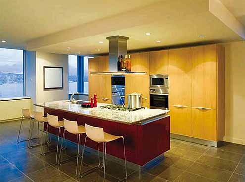 A megvilágítás tervezése Az általános világításhoz tartoznak azok a fényforrások a konyhában, melyek célja, hogy egyenletesen, az általános ott-tartózkodáshoz elegendő fénnyel bevilágítsák az egész teret úgy, hogy ne alakuljanak ki sötétebb sarkok, és a benne tevékenykedő ember is minél kevésbé árnyékolja be saját munkaterületét. Értelemszerűen itt kell a legnagyobb fényerejű, és garantáltan a legjobb hatásfokú, legjobb minőségű fényt előállító fényforrásokat használni. A helyi megvilágítások célja, hogy többlet fényt juttassanak azokra a helyekre, ahol tartósan munka folyik, vagy különösen fontos a jó megvilágítás. Ilyen megoldás lehet, hogy plusz fényforrást szerelünk a tárolóhelyek belsejébe is. A kisebb megvilágítandó felületek miatt kisebb fényáram elegendő, ám mivel több helyen van rá szükség, ezek összteljesítménye számottevő lesz. A díszítőfények funkciója, hogy saját megvilágítást kapjanak az egyes díszítőelemek, vagy akár maga a fényforrás legyen díszítőelem, ezzel esztétikailag sokkal kellemesebbé téve a teret. A díszítőfényekkel kiegyensúlyozhatjuk azt a képet, amit a konyha tár elénk. Az egyes díszítő megvilágításoknál lényeg az adott térrész jellegzetességeinek kiemelése, vagy az elhelyezett installáció megfelelő megvilágítása. Ennek megálmodása kifejezetten kreatív feladat. A díszítőfényeknél általában kevés fény is elég, de gyakran fontos a kompakt, diszkrét elhelyezés. Szintén sok lehet belőlük. Az árnyékok képződése akkor a legkellemesebb, ha az érkező fény minél nagyobb felületről érkezik, és ez a felület matt, azaz rajta a fény szórtan (diffúzan) verődik vissza. Még az erős megvilágítást sem érezzük zavarónak, ha az egyeletes, és az árnyékképződés lágy. Az árnyékképződés annál lágyabb, minél nagyobb a szórt fényt biztosító felület vagy az a felület, ami a fényvető éles fényét szórtan visszaveri. A derített fény fontos a helyi megvilágításoknál is, éles, erős, drámai árnyékokkal csak a díszítő megvilágításoknál dolgozunk. Káprázás jön létre, ha a szem látóterében vannak olyan részek, ahonnan sokkal erősebb (azaz sűrűbb) fény érkezik, mint az átlagos fénysűrűség. Ez erősen fárasztja az idegrendszert. A káprázás elkerüléséhez az is fontos, hogy a fényt visszaverő felületben ne tükröződjön a fényforrások fénye, azaz a felületek ne tükrözve, hanem szintén szórva verjék vissza a fényt. Szinte minden fényforrás fénye túl erős ahhoz, hogy megengedjük, hogy belőlük a fény közvetlenül az emberi szembe juthasson. Ezért a fényt árnyékolni és/vagy lágyítani kell. A fényt úgy lágyítjuk, hogy a fényforrást olyan felületre irányítjuk, ahonnan diffúz módon visszaverődik a tárgy irányába, vagy amin áthaladva a fény szétszóródik (diffúz lesz). Ez a diffúzor lehet egy hatalmas lámpabura vagy matt üveglap, de lehet akár a hófehér mennyezet is. Az árnyékolás megfelelő irányba visszaveri (vagy pazarló módon elnyeli) azt a fényt, amely a fényforrásból olyan irányba indulna, ami emberi szembe juthatna. Azaz csak a megvilágított felület felé enged fényt. A díszítő fényeknél előfordul, hogy visszafogottabb fényük nem igényel fényformálást. A fényviszonyokat alapvetően befolyásolja, hogy az egyes látható felületek a rájuk eső fény hány százalékát verik vissza. Ezért ajánlott fényvisszaverési értékek mennyezetre: 60-90%, függönyök drapériákra: 35-60%, falakra: 40-90%, padlóra: 15-35%. A megvilágítás erősségének és színhőmérsékletének tervezése igen terjedelmes témakör, de annyit azért érdemes megemlíteni, hogy egy leegyszerűsített, lényeget összefogó szabály szerint a gyenge megvilágításoknál (<500...1000 lux) meleg, közepes megvilágításnál (500...1000-1000...4000 lux) semleges színhőmérsékletű fényforrást érdemes használni. Az embernek kb. 2000 lux megvilágításnal a legnagyobb a teljesítménye, azaz az ilyen megvilágításnál fárad a leglassabban, ha olyan feladatot végez, ahol fontos a látásból származó információk feldolgozása. A túl erős vagy túl gyenge megvilágítás is negatív hatással van a teljesítményre. Több órán keresztüli munkához 500 luxnál kisebb megvilágítás semmiképpen sem javasolt.