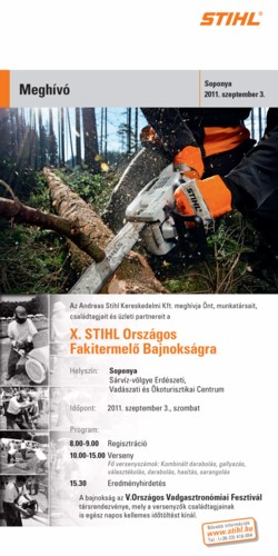 Az Andreas Stihl Kereskedelmi Kft. meghívja Önt, munkatársait, családtagjait és üzleti partnereit a X. STIHL Országos Fakitermelő Bajnokságra.
