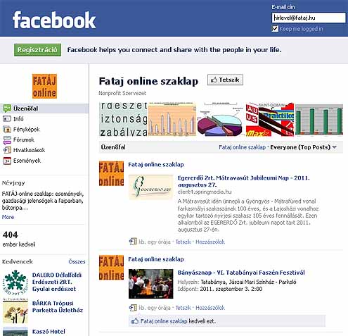 Bizonyára a FATÁJ olvasói között ennél jóval többen vannak olyanok akik a Facebook rendszerét már használják. Mivel az eltelt időszakban számos olyan hivatkozást is megosztottunk (postoltunk) FB felületünkön, amely a 'hivatalos' FATÁJ oldalra nem került fel, mindenkinek javasoljuk, adja hozzá kedvenceihez az oldalt, 'lájkolja'. Ezáltal gyakorlatilag azonnal értesülhet a változásokról, új eseményekről, hírekről...