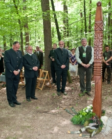 A megemlékezés kezdetén Áprily Lajos Szeret az erdő című versét Böröczki Péter előadásában hallhattuk, majd J. S. Bach C-dúr szvitjének dallamai csendültek fel, gordonkán játszotta Valter Izabella. A muzsika hangjai és a madarak éneke gyönyörű egységbe olvadtak a szálalóerdő lélegzetével, s az ünneplő sokaság megindult szívvel állta körül Hajdu Tibor kopjafáját. A magyar erdőmérnökök jeles képviselője, a zalai erdő- és vadgazdálkodás elismert vezetője, legendás FIRMA, példás családapa és nagyszerű barát emlékét idézte Zambó Péter az OEE elnöke. Szívhez szóló kopjafaavató beszédében ismertette Hajdu Tibor példás életútját az egyházi gimnáziumi tanulmányoktól kezdve, a katonaságban és az egyetemi közösségben betöltött meghatározó szerepén át a szakmában végzett értékteremtő munkájáig. A valódi értékeket tisztelő, a másik embert megbecsülő, a gyengébbeket felkaroló személyisége a soproni Alma Mater falai között találkozott az újraéledő selmeci hagyományokkal, így vált igazi FIRMÁvá, valétaelnökké, kinek szelleme máig lelkesíti az egyetemisták generációit. Erdőmérnöki pályáját 1982-ben Zalában erdőtervezőként kezdte, majd rátermettségét korán bizonyítva hamarosan irodavezetővé nevezték ki. 1996-tól haláláig a Zalaegerszegi Erdőfelügyelőségnek, majd jogutódjának köztiszteletben álló igazgatója volt. Több cikluson keresztül elnöke volt az OEE zalaegerszegi helyi csoportjának, oszlopos tagja a vadgazdálkodási szakosztálynak. Palotay István gazdag szakmai örökségének szellemében folytatta kiváló munkáját, melynek eredményeként a szentgyörgyvölgyi erdőben újra bevezették a szálaló erdőgazdálkodást. Az avatóbeszédet követően Jagicza Attila a Zala Megyei Kormányhivatal Erdészeti Igazgatóságának igazgatója ismertette a kopjafa gazdag szimbólumrendszerét. Mi, emberek mindig vágyunk az emlékezésre, melyre különösen is méltó ez a jelkép, mert úgy szól hozzánk csendesen, mint az erdő. Hajdu Tibor kopjafáján a korán végetért, de kiteljesedett élet üzenetét olvashatjuk. A letört ágú tölgyfa és a fölötte álló öt körbefutó gyűrű a fájdalmasan rövid életet szimbolizálja. A család legszebb éke a három lánygyermek, őket jelképezi a három virág. A szakmai hivatás, a mérnöki tudomány kiteljesedésének jelképe az átlós kereszt. A rövid földi lét szimbóluma a csonka kúp, melyen a férfit, a teljességet és a fénylő életet jelképező gömb nyugszik. Végezetül néma tiszteletadás keretében az Erdészeti Igazgatóság, a Zalaerdő Zrt. és Hajdu Tibor volt évfolyamtársai nevében elhelyezték az emlékezés koszorúit a kopjafa tövénél, majd az egybegyűltek közösen elénekelték az erdész himnuszt. Forrás: Zalaerdő Zrt.