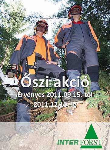 Az Interforst Hungary Kft erdőgazdálkodási segédeszközökre, berendezéseke, gépekre vonatkozó akciós katalógusát ide kattintva lehet letölteni. Az akció érvéyes 2011. szeptember 15 - december 10. között.