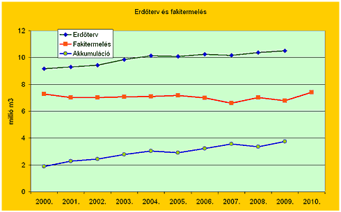 Az erdőtervi lehetőségek és a fakitermelés különbsége, az évi akkumuláció az évtized során folyamatosan emelkedve 1.896 e m-ről 2009-re 3.735 e m3-re, tehát lényegében a duplájára nőtt. A fakitermelés ugyanakkor részben a viharkárok miatti 2010. évi növekedésével is az évtized egészében lényegében változatlan. A hazai erdőkben tehát jelentős tartalékok gyűlnek a különböző fafelhasználási célok keresletének, leendő keresletélénkülésének kielégítésére. (A nem erdőgazdálkodók részére: Vigyázat az alábbiak bruttó fakitermelési és lehetőség adatok, amivel szemben tényleges árualapként a mintegy 15-20%kal alacsonyabb értéket mutató nettó m3 adatok lennének figyelembe vehetőek! Ez utóbbira azonban nincs országos statisztika az erdőgazdálkodók jelentései alapján.)
