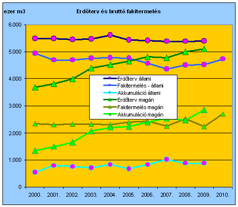 Az államiak erdőtervi lehetősége változatlan, vagy egészen enyhén csökken, míg a magán erdőgazdálkodók erdőtervi lehetősége határozott növekedést mutat: közel 1,5 millió m3-rel nagyobb az évi lehetőség, sőt ha ismernénk a 2010. évi adatot, lehet hogy e növekmény meg is haladta a 1,5 millió m3-t. A fakitermelésben az államiaknál az évtized első kétharmadában jól érzékelhető a visszaesés, amit ugyan növekedés követett, de 2010-re sem lett több, mint 2000-ben volt. A tendencia tehát enyhén csökkenő. A magánosoknál a fakitermelés ugyanakkor enyhén növekvő, amely adatsorból kicsit kilóg a 2010. évi erősebb termelésbővülés. A magánosok fakitermelése azonban messze nem követte a lehetőségek bővülését. Az akkumuláció terén az látható, hogy az államiak nagyjáből egyenletesen és jobban kihasználják a lehetőségeket, mint a magán erdőgazdálkodók. Az utóbbi körben az időszak elejei 1,35 millió m3-ről a végére 2,86 millió m3-re nőtt! A magán erdőgazdálkodók tehát valamilyen okból nem tudják vagy nem akarják kihasználni fakitermelési lehetőségeiket. Legalább is az MGSZ-EI adataiból ez olvasható ki.