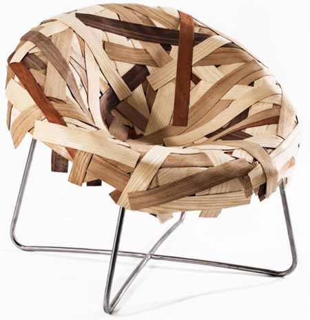 A foteleket parkettaszerű darabokból [Nevezzük inkább furnér-eseléknek! FATÁJ szerk.] ragasztották össze. A furnéranyagok mindegyike teljesen egyedi, így az újrahasznosított fotelból sosem készül két egyforma.