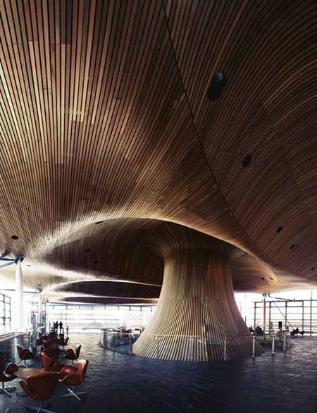 Wales Nemzetgyűlésének belső terének egy részlete is megtalálható a fenti gyűjteményben, de a Green Renaissance gazdája nem tudta, pontosan hol lehet ez a hely, a hozzászólók segítettek ebben neki. Ez alapján eljutottam Wales Nemzetgyűlése (parlament) honlapjára, ahol pedig megtalálható a belső terket online körbejáró, bemutató alkalmazás: http://senedd.nafw-server.org/en/index_standalone.html. Hű, ez nagyon érdekes és érdemes rá időt szánni. Rengeteg faanyagot építettek be, gyönyörű belső tereket alkotva.