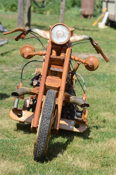 Múlt héten vonult le a Harley-Davidson találkozó, ám vizuális utórezgésként itt van egy gyöngyszem: Puskás István traktoros akácból épített motorkerékpárjával "repeszt" tiszaörsi háza előtt. A férfi két év alatt építette meg fa-chopperét, amelyet egy 126-os Polski Fiat motor gyorsít fel 25-30 kilométer/órás végsebességére.