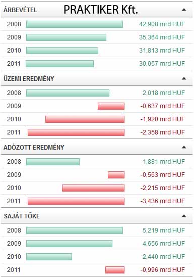 Az első negyedévben 12,1 százalékkal 155,2 millió euróra esett a Praktiker kelet-európai leányvállalatainak forgalma és úgy tartották, csupán miattuk nőtt a csoportszintű negyedéves adózott veszteség a bázis ötszörösére, 76 millió euróra. Régiónk nyolc országában 107 áruház tartozik a céghez. A 19 áruházában már csak 1100 főt foglalkoztató magyar leányvállalat vesztesége tavaly 50 százalékkal 3,4 milliárd forint fölé nőtt. A likviditást a cég a konszernen belüli kölcsön felvételével biztosította.