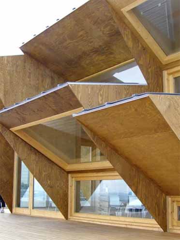Közelebb kerülve enyhül a kép. A fényes napelem-pikkelyeket hegyes natúr fa felületű ékekre építették, és üvegtáblákon keresztül a szokatlan forma belsejébe is bepillanthatunk. Az építmény a Distributed Intelligence (megosztott intelligencia) koncepcióját az építészet nyelvére lefordító kísérleti pavilon, melyet Endesa Pavilion, Solar House 2.0 elnevezéssel a novemberben megrendezésre kerülő Smart City Expo előhírnökeként állították fel a katalán főváros Olimpiai Kikötőjében.
