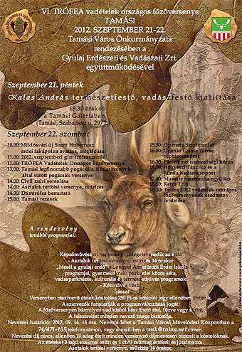 Szeptember 22. szombat 10.00: Miklósvári új Szent Hubertusz erdei fakápolna avatása, megáldása 11.00: 2012. szeptemberi gím trófeaszemle 11.00: TRÓFEA Vadételek Országos Főzőversenye 13.00: Tamási legfinomabb pogácsája, háziasszonyok által sütött pogácsák versenye 14.00: Civil zsűri sorsolása 14.00: Asztalok terítési versenye, zsűrizés 14.30: Dámtrófea bemutató 15.00: Tamási rezesek 15.30: Operetta Színtársulat 16.00: Gyönki Grüne Wiese néptánccsoport 16.30: Pári német nemzetiségi kórus 16.50: Hőgyészi Táncika és a Jamila hastánccsoport 17.40: Musette harmónika együttes 18.10: Retro Trió 18.30: Trófea 2012 vadételek országos főzőversenyének eredmény