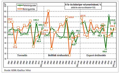 A hazai fafeldolgozó-ipar 2004-07 között lényegében követi a nemzetközi tendenciákat, 2008-ban azzal ellentétes irányba fordul, így a visszaesés 2009-ben sokkal erőteljesebb. 2010-ben követve a külpiaci tendenciákat, az EU átlagánál jelentősebb mértékű növekedést mutatott. 2011-ben igazodva a nemzetközi trendekhez a faipar termelése csökkent (-11,6%), mértéke azonban a korábbiakhoz hasonlóan lényegesen erőteljesebb mint az EU-27, vagy az EU-15 esetében. Az egyes negyedéveket tekintve a visszaesés üteme a harmadik negyedévig gyorsult, a múlt év utolsó negyedévében azonban jelentősen lefékeződött. 2012 I. negyedévében az európai tendenciákkal szemben 7,9%-os növekedést mértek a hazai faipar esetében. Bútorgyártásunk tendenciájában lényegében követi az európai folyamatokat a fordulatok azonban sokkal élesebbek, a csúcsok magasabbak, a visszaesések mélyebbek. Ennek a tendenciának a folytatását láthattuk 2010-ben is. A múlt év egyes negyedéveiben a csökkenés üteme lassult, az utolsó negyedévben pedig növekedésbe fordult. A bútorgyártás teljesítménye 2011-ben, az EU-s eredményekkel ellentétben, 0,8%-kal csökkent. Az éves összteljesítmény visszaesése lényegében a harmadik negyedévben bekövetkezett 6,9%-os termelés-csökkenésre vezethet ő vissza. Az év első felében, illetve a negyedik negyedévben az ágazat pozitív egyenleggel zárt. 2012 január-márciusban az ágazat termelése növekedett (2%), az előző év utolsó negyedévének pozitív tendenciáját folytatva.