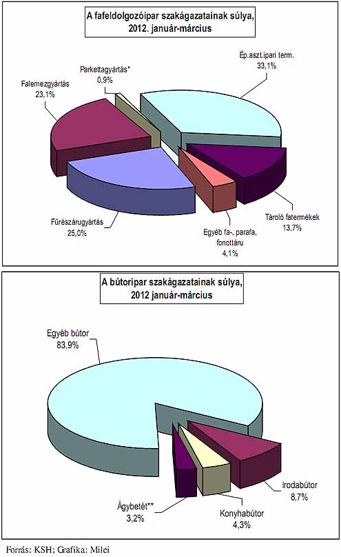 A fafeldolgozó-ipar termelése 2012 I. negyedévében 9,4%-kal emelkedett az egy évvel korábbi 8,6%-os növekedéshez képest. 2012 márciusában 8,4%-kal nőtt a termelés az el őző év 13,4%-os csökkenés bázisán. A szakágazat hazai értékesítése 2012 első három hónapjában 1,9%-kal, márciusban pedig 8,5%-kal csökkent. Az ez év januármárciusi exportértékesítés 18,8%-kal emelkedett a múlt évi 1,3%-os csökkenés bázisán, márciusban pedig a szakágazat kivitele 23,5%-kal növekedett az egy évvel korábbi 14,4%-os visszaesés bázisán. A hazai bútoripar 2009-ben kezdődött mélyrepülése 2012 első negyedévében megállni látszik. Az ágazat termelése 2,9%-kal emelkedett. A belföldi értékesítés változatlanul csökken (-5,9%) a múlt évi 3,2%-os csökkenés bázisán. Az export a január-márciusi id őszakban 6,9%-kal bővült, ezen belül márciusban 4,9%-kal nőtt az egy évvel korábbihoz képest.
