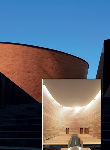 A kápolna ezen részeiben zajlik a munka, lelkészek és szociális munkások munkahelye ez. A belső térbe lépve gyönyörű íves, tiszta felülettel találkozunk. A szakrális tér tömörfából készült olajozott felülettel. Egyetlen ablaka sincs, így különösen alkalmas a világtól való csendes elvonulásra, a mennyezeti megvilágítás teszi igazán meghitté a belső teret. A berendezés, a padok és az "oltár" szintén nagyon puritán. Az épület teljes homlokzata hossztoldott lucfenyőből készült deszkaborítást kapott. A nanotechnológiával modifikált felületet pigmentált viasz felületkezeléssel védik az időjárás viszontagságaitól. Az épület konstruktív váza CNC-technológiával kialakított elemekből épült fel.
