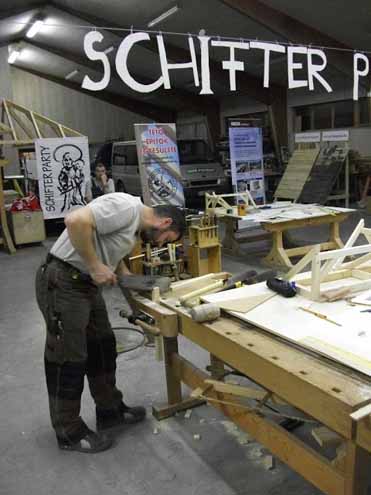 A második Schifter-party-n a korábbi évben kipróbált lépéseken voltaképpen nem kellett változtatni. A résztvevők péntek reggel-délelőtt érkeztek, a korábban érkezők berendezték a műhelyt, előkészítették a szükséges anyagokat és eszközöket. A jól felszerelt műhelyben ez hamar megtörtént, és már ebéd előtt elkezdődött a munka. A résztvevők mindahányan kaptak egy füzetet, amiben a kész szerkezetről készült rajzok, anyaglista, valamint a szerkesztés lépései találhatók. A magyarázatokat Hantos Zoltán, a nemzetközi ács versenyek magyarországi szakértője adta, kivetített előadással. A résztvevők (oktatók és diákok közösen) az instrukciók alapján haladtak a rajzzal illetve a megmunkálással. Az első napon a rajz főbb körvonalai és a készülő tetőcske szelemenjei, oszlopjai készültek el, és egy-egy szarufa is. Nem a sebesség volt a lényeg, inkább a maradandó ismeret. A vacsora, mint szertartás része a műhely összetakarítása, hiszen a csapat ott eszik, ahol dolgozik.