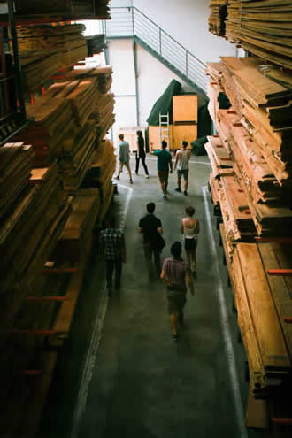 Pozsár Péter arra kérte a fiatal építészeket és designereket, hogy azzal a szemmel nézzék és tapintsák végig a Jaf Holz területén látható, különböző színű, fomájú és textúrájú fafajokat, hogy melyikkel dolgoznának az általuk elképzelt projekteken. Kedves tömeg andalgott végig a megszámlálhatatlan formájú, hosszúságú, tapintású, illatú faáruk mellett. Bejártunk mindent, a friss fák szárítási pihenőhelyétől a lapszabászaton át a furnér raktárig, betekintést nyerve egy precízen és így sikeresen működő cég tevékenységeibe.