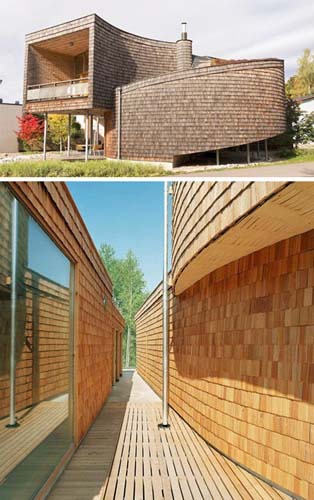 A finn hagyományt követve a fa mindenütt megtalálható a lakásban, szerves kapcsolatot alkotva a lakójával, íveltre hajlított megjelenéssel, ahol a beton és az acél másodlagos szerepet játszik.