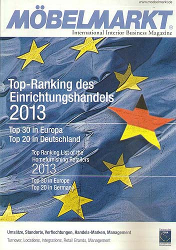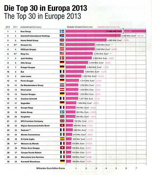 A MÖBELMARKT elkészítette a speciális összeállítását, a 2013-as lakberendezési/bútorforgalmazó cégek, cégcsoportokk (valójában a 2012-es eredmények alapján összeállított aktuális lista - FATÁJ szerk.) európai/német toplistáját. Idén először már azt is megoldotta a szaklap szerkesztősége, hogy a listán megjelenhessen az Amazon és az Ebay online áruházlánc is (persze csak a bútorok forgalmi értékével)!